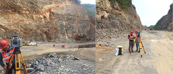 融水至河池高速公路主线全长107.564km。双向4车道,采用高速公路标准建设,设计车速100Km/h,路基宽度26m。其中,广西交通检测工程公司承接融河高速27个大型边坡的监测工程,如果采用传统全站仪布点方式监测,需要在坡体岩石上打上观测棱镜,密度约30米1个,每个高度50米,现场需要工程升降车配合,比较麻烦,作业难度大,坡体不稳定随时有落石的危险,对作业人员安全构成严重威胁。