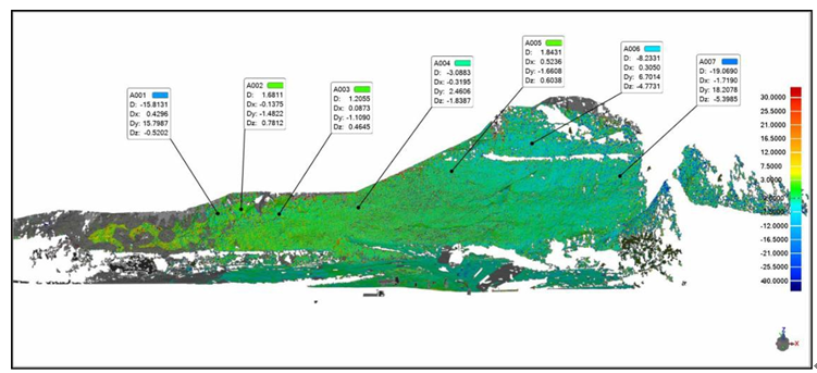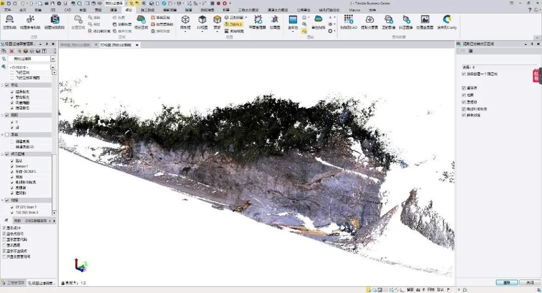 由于SX10扫描点云具有绝对坐标,内业不需要拼接和坐标转换,对电脑硬件要求不高,普通笔记本即可。内业利用Trimble Business Center的自动分类功能,就可以自动提取高速公路边坡,剔除杂点,然后简单的编辑点云就可以得到纯净的路面点云模型。同样是由于测量数据本身具备绝对坐标,因此无需对齐,多次测量数据即可叠加,直接进行三维对比分析,得出检测结果。