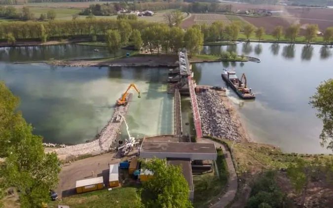项目施工现场,正在修建上游和下游的临时水坝