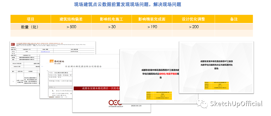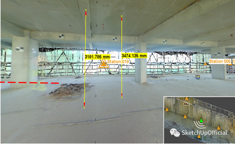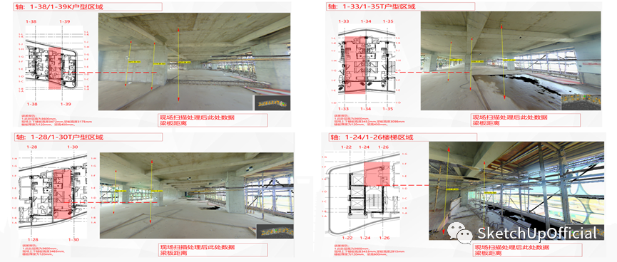 为什么要加这一步骤呢?因为土建阶段导致的小变更往往不会落实到图纸上,装修如果按照原来的图纸去设计、下料、安装,很多天花标高保证不了,会引发更多的变更,从而在时间上超出预期工期。因此利用点云扫描,将实际修建的尺寸落实更新到模型上,再进行深化设计,确保了模型与现场的一致性。