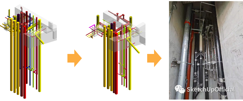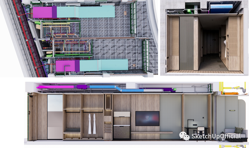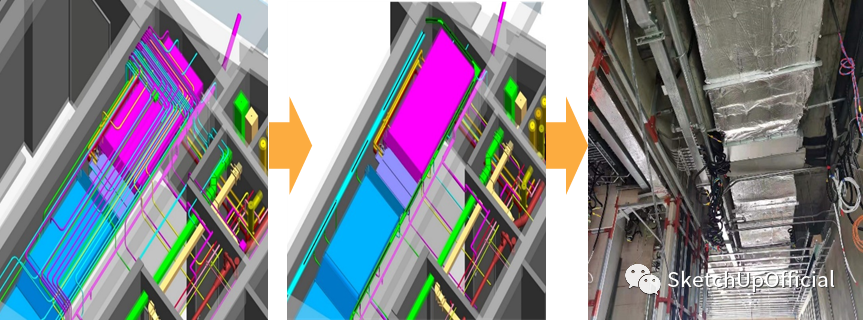 通过BIMfor云端协同设计平台与SketchUp插件交互,不需要文件下载、拷贝,通过SketchUp插件可以直接将模型文件上传至云端,节省大量时间,实现了过程的沟通、数据信息的共享及传递,减少了传统施工图的错漏碰缺。全专业设计过程中高度协调,提高了专业间设计会签效率,更高效的把控项目设计的进度和质量。 现场/模型/效果图对比