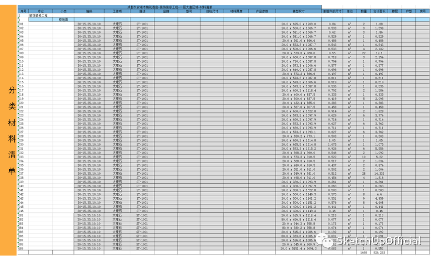 以往算量场景:深夜,在项目部,工作人员将厚厚的一摞图纸放到桌前,开始了漫长的算量之旅,记录每一张图纸的面积数据,进行算量统计工作……本项目基于国标GB/T51269做了一套企业标准,梳理了算量的从属关系。在建模过程中,通过SketchUp的动态组件赋予信息,结合编码固化材料的算量尺寸,不同的材料对应不同的算法,最终一键导出,得到适用于施工使用的物料表清单。通过编码体系赋予模型信息,一键生产物料表清单,让BIM模型指导后期施工成为可能,将设计与施工打通,这其实也是BIM正向设计的最终目的。后期考虑未来运维,通过BIM模型提供数据服务,也是十分便捷的。