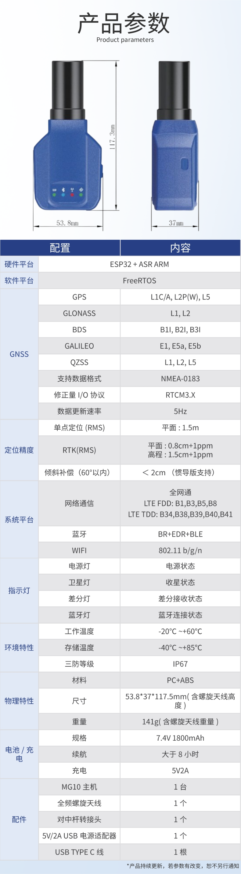 53.8*37*117.5mm(含螺旋天线高度)