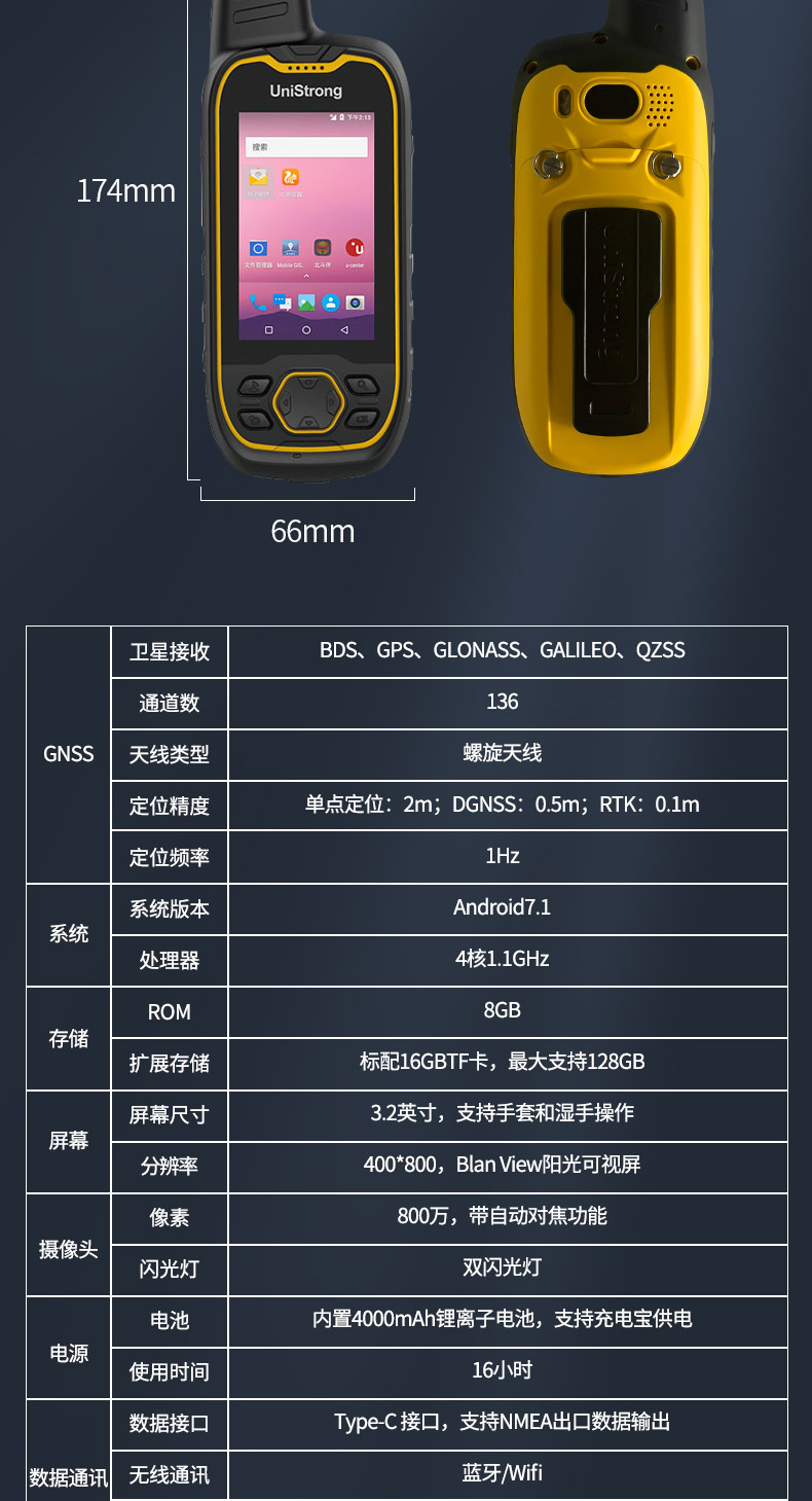 定位精度:单点定位:2m,DGNSS:0.5m,RTK:0.1m