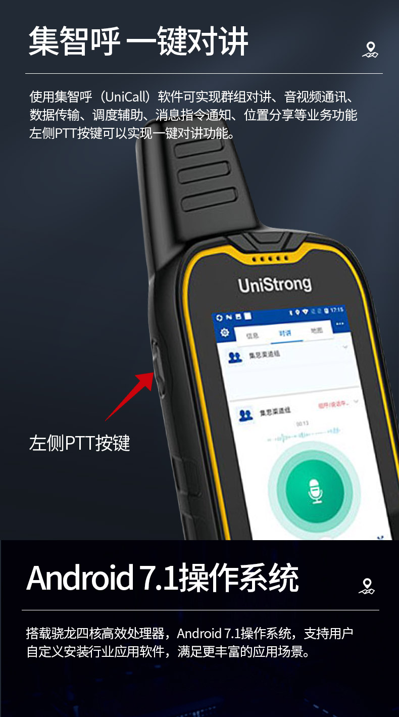 使用集智呼(UniCall)软件可实现群组对讲、音视频通讯、数据传输、调度辅助、消息指令通知、位置分享等业务功能,左侧PTT按键可实现一键对讲功能。