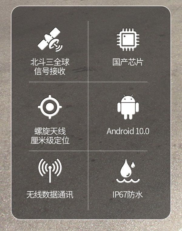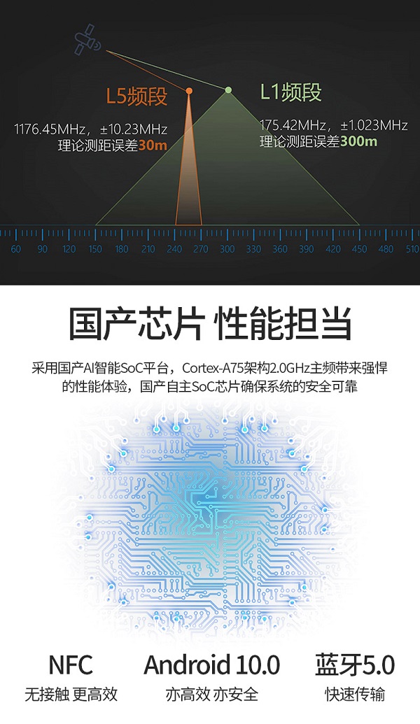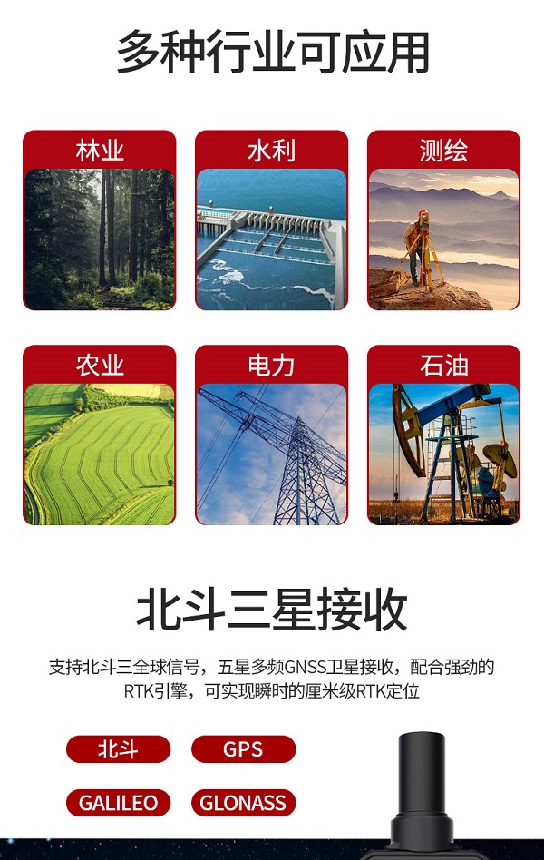 支持北斗三全球信号,五星多频GNSS卫星接收,配合强劲的 RTK引擎,可实现瞬时的厘米级RTK定位。