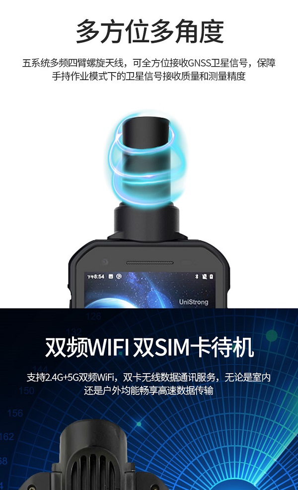 五系统多频四臂螺旋天线,可全方位接收GNSS卫星信号,保障手持作业模式下的卫星信号接收质量和测量精度。