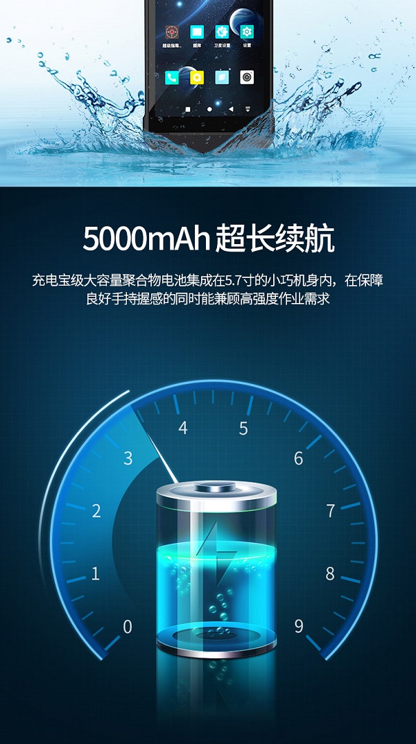5000mAh大容量聚合物电池集成在5.7寸的小巧机身内,在保障良好手持握感的同时能兼顾高强度作业需求。
