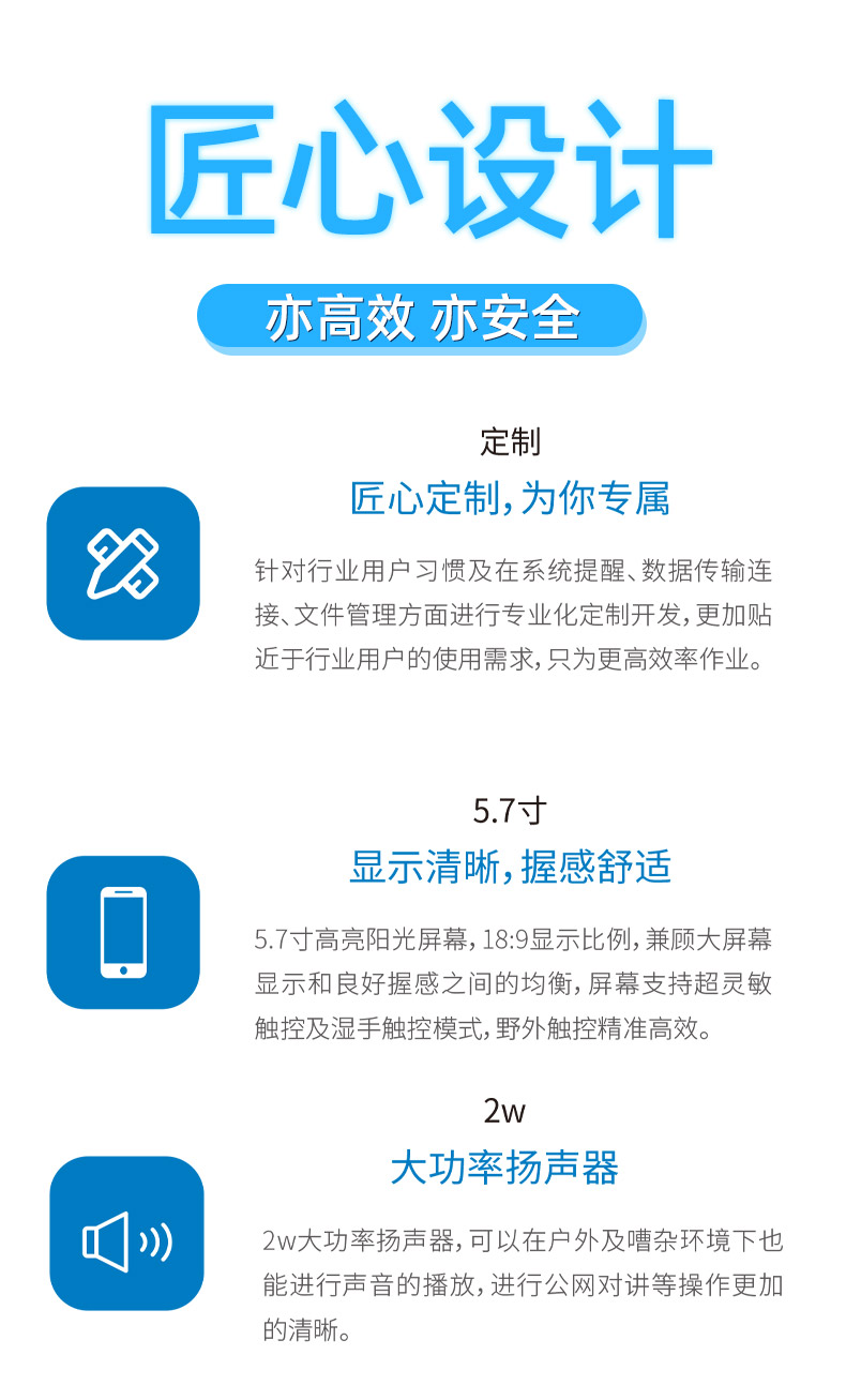 5000mAh大容量聚合物电池集成在5.7寸的小巧机身内,在保障良好手持握感的同时能兼顾高强度作业需求。