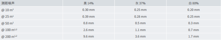 1 数据速率 136,719 点/秒(相当于“高分辨率/好质量”设置),1 Sigma 测距噪声,未经过滤的原始数据。