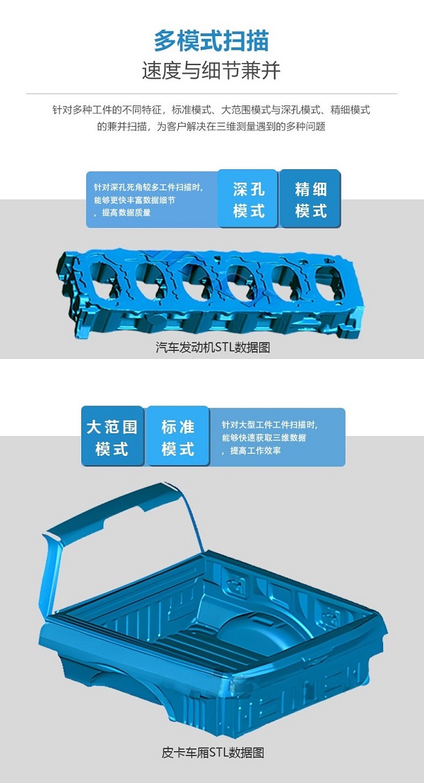 2、单束激光:可切换成单条激光线扫描模式,适合于扫描深孔及死角;