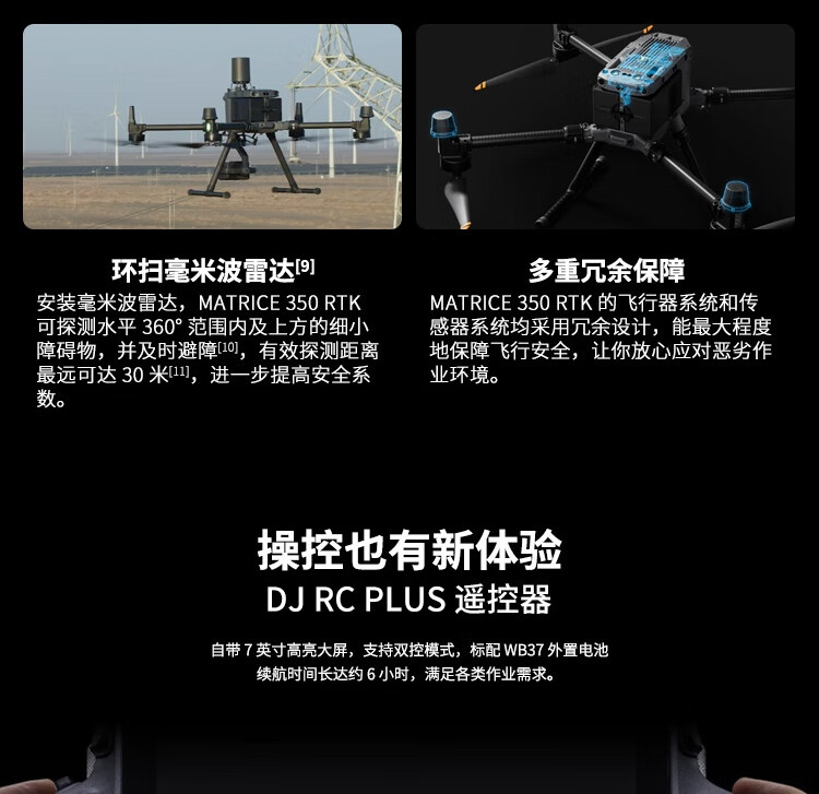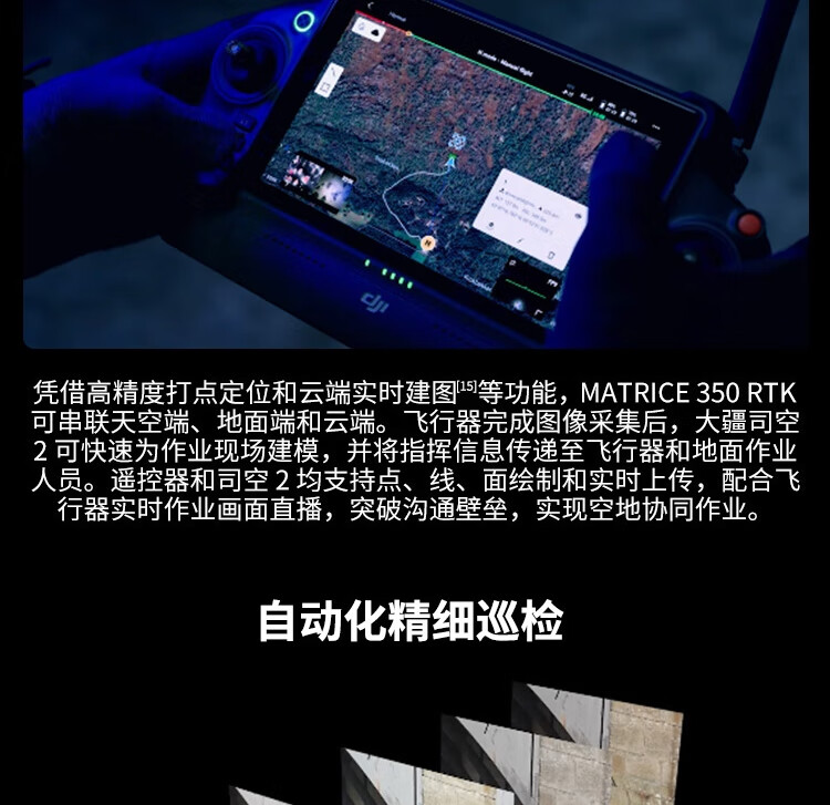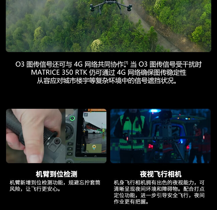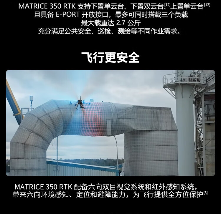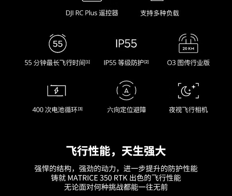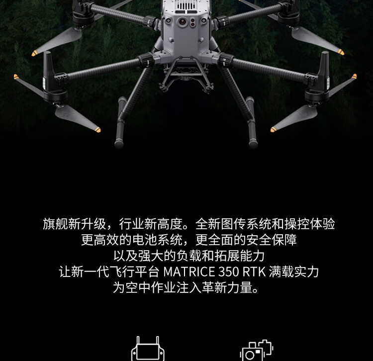 旗舰新升级,行业新高度。全新图传系统和操控体验,更高效的电池系统,更全面的安全保障,以及强大的负载和拓展能力,让新一代飞行平台 Matrice 350 RTK 满载实力,为空中作业注入革新力量。