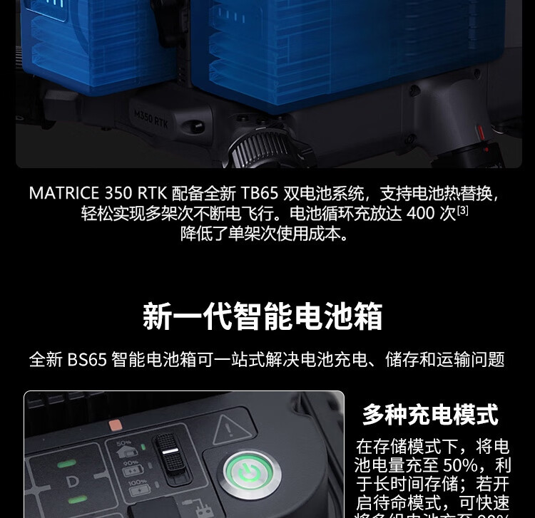 充电时间:使用220伏电源时,完全充满两块TB65智能飞行电池约60分钟,从20%充到90%约30分钟;使用110伏电源时,完全充满两块TB65智能飞行电池约70分钟,从20%充到90%约40分钟
