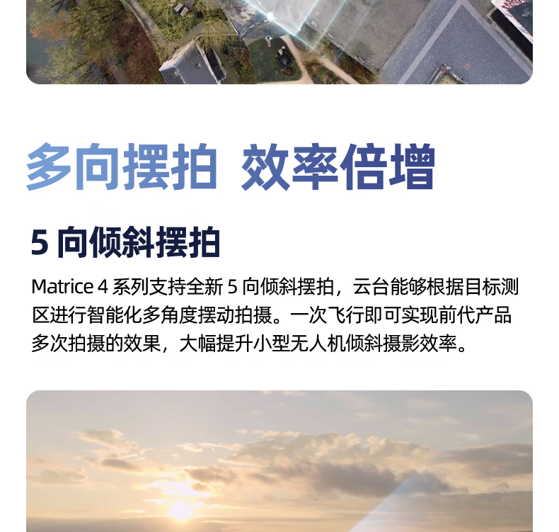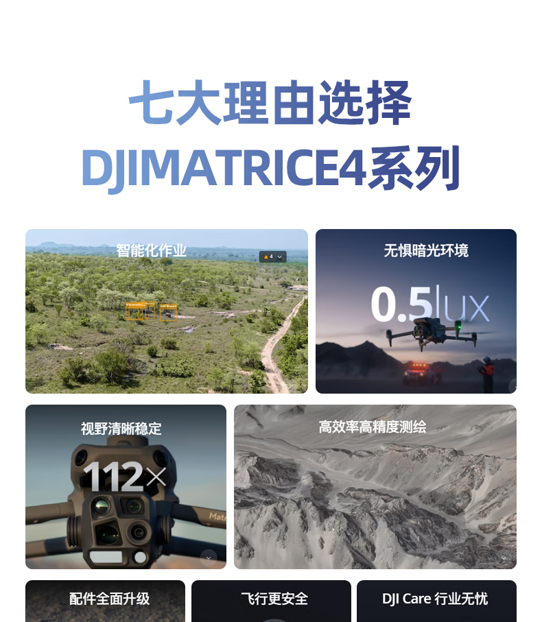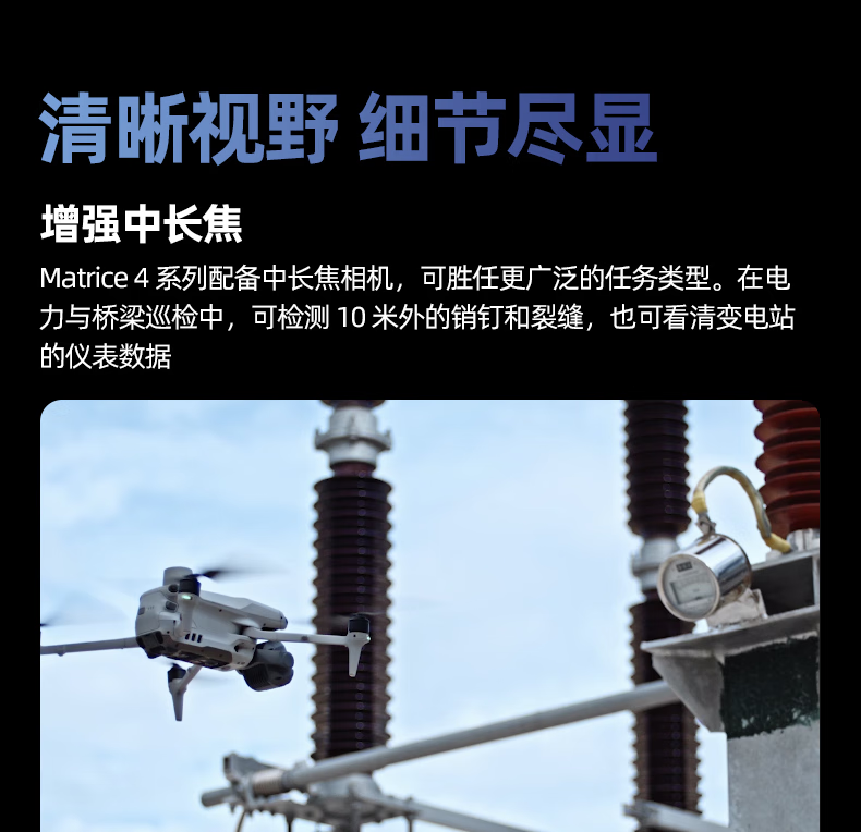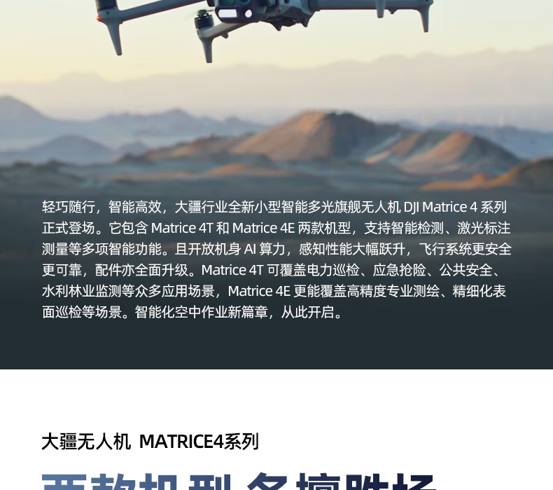 轻巧随行,智能高效,大疆行业全新小型智能多光旗舰无人机 DJI Matrice 4 系列正式登场。它包含 Matrice 4T 和 Matrice 4E 两款机型,支持智能检测、激光标注测量等多项智能功能。且开放机身算力,感知性能大幅跃升,飞行系统更安全更可靠,配件亦全面升级。Matrice 4T 可覆盖电力巡检、应急抢险、公共安全、水利林业监测等众多应用场景,Matrice 4E 更能覆盖高精度专业测绘、精细化表面巡检等场景。智能化空中作业新篇章,从此开启。