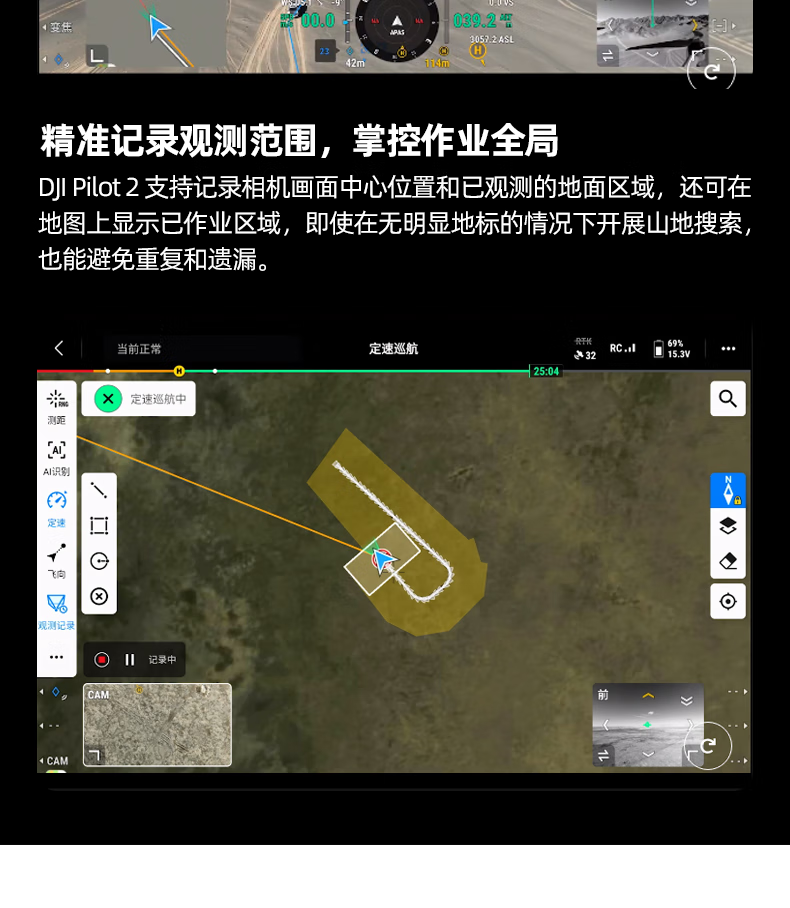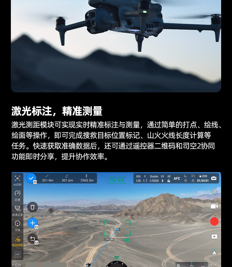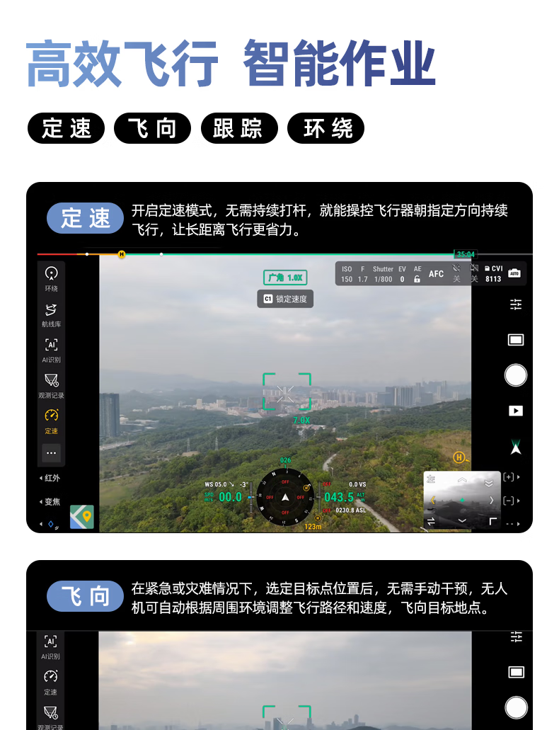 下视:测距范围0.3米至18.8米;有效避障速度≤10米/秒;视角前后160°,左右160°